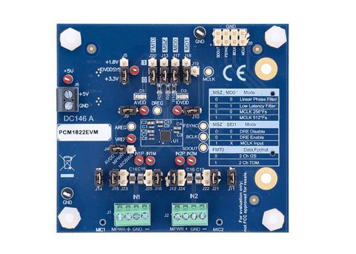 হার্ডওয়্যার-নিয়ন্ত্রিত অডিও এডিসি কনভার্টার পিসিএম ১৮২২ এর জন্য মূল্যায়ন মডিউল, এমবেডেড সলিউশন বিকাশ এবং পরীক্ষার জন্য ডিজাইন করা হয়েছে।
